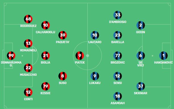 Trajneri Xhampaolo ka pasur dyshime deri në momentet e fundit për mesfushën dhe sulmin. Ai ka vendosur që titullar të jetë Lukas Bilia para algjerianit Benaser. Në mesfushë ka vend edhe për Çalhanoglu dhe Kesi. Në sulm preferohet Paketa në të majtë në vend të kroatit Rebiç, i ardhur te kuqezinjtë në fund të merkatos. Suso dhe Piatek plotësojnë repartin e avancuar, ndërsa para Donarumës luajnë Konti dhe Rikardo Rodrigues në krahë dhe Romanjoli dhe Muzakio në qendër.