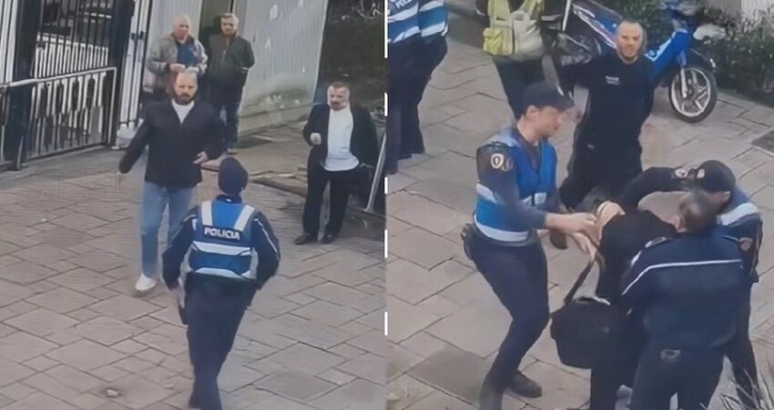 Ata kanë pritur policinë, e cila i ka vënë prangat menjëherë në oborrin e gjykatës, ku shihet 30-vjeçari, i cili qëndron i qetë, me duar në xhepa, pas kryerjes së krimit.