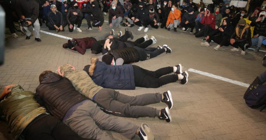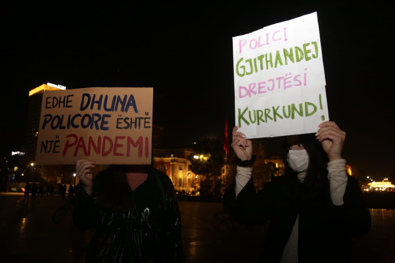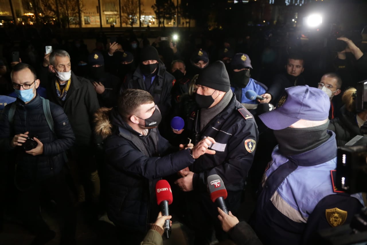 Forcat Speciale kanë krijuar një bllokadë para Drejtorisë së Policisë Tiranë, duke mos i lejuar protestuesit që të afrohen. Nga ana tjetër protestuesit i janë përgjigjur me gjestin simbolik të shtrirjes në rrugë me duart mbi kokë.