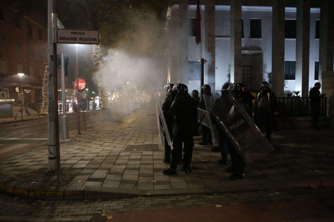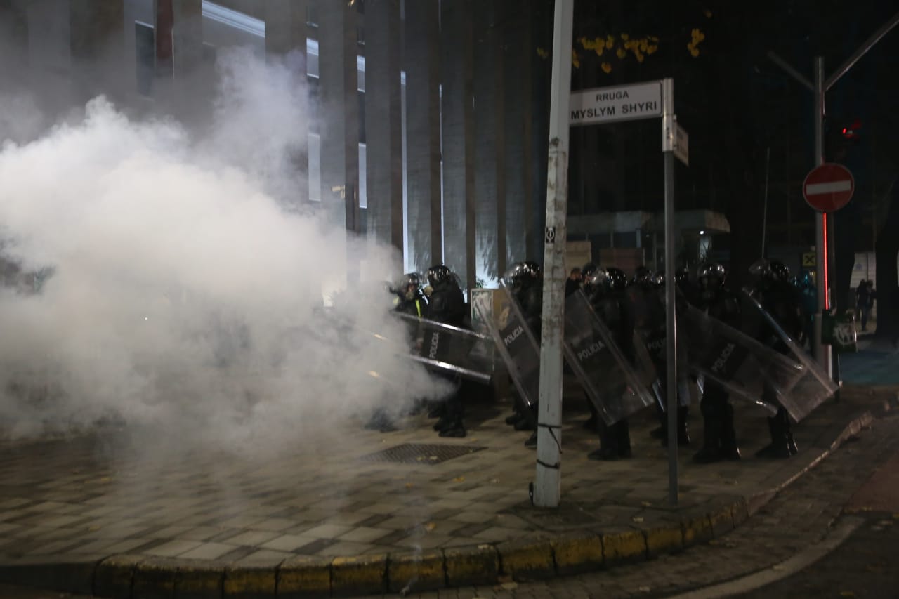Disa protestues më pas gjuajtën me gurë dhe menjëherë pati një reagim nga uniformat blu duke hedhur gaz lotsjellës si dhe autoboti ka hedhur ujë me presion mbi protestuesit.