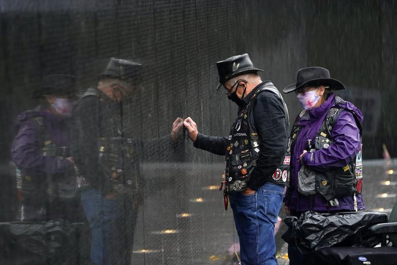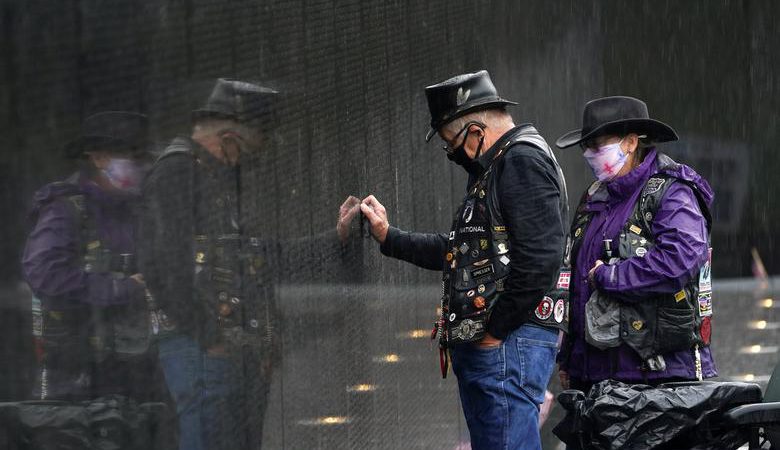 Doc Spresser, nga Frankford, i cili shërbeu në Vietnam nga 1969 deri në 1970, vendos dorën e tij në një emër në Memorialin e Veteranëve të Vietnamit në Uashington.