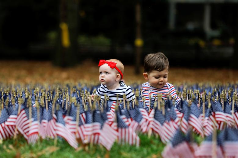 Në një lagje të Manhattan janë vendosur qindra flamuj në një fushë.