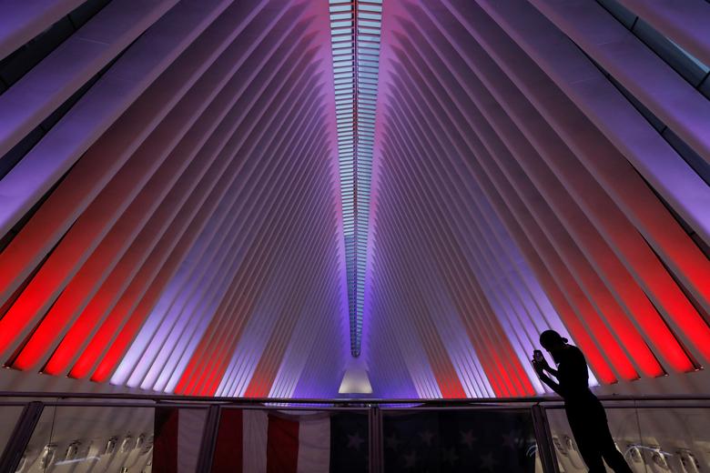 Një person bën një fotografi në një Qendër transporti që është ndriquar për të nderuar Veteranën e luftës.