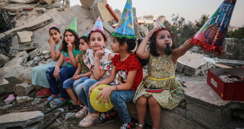 Shokët e 13-vjeçarit Mahmoud Sabih në Gaza festojnë ditëlindjen e tij mes rrënojave të shtëpisë së tyre të dikurshme, të shkatërruara pas sulmeve nga Izraeli.