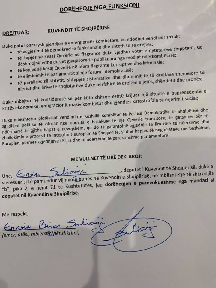 Në tekstin e letrës së dorëheqjes nga mandati, theksohen pesë arsyet kryesorë të djegies së mandatit.