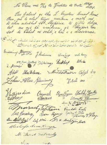 Në Vlorë me 15/ 28 nëntor 1328/1912 . Pas fjalimit të mbajtur nga Presidenti, Ismail Qemal Beji, në të cilën ai foli rreth rreziqve të mëdha me të cilat përballet Shqipëria sot, delegatët të gjithë vendosën unanimisht se Shqipëria, duhet të jetë më vete, e lirë dhe e pavarur.