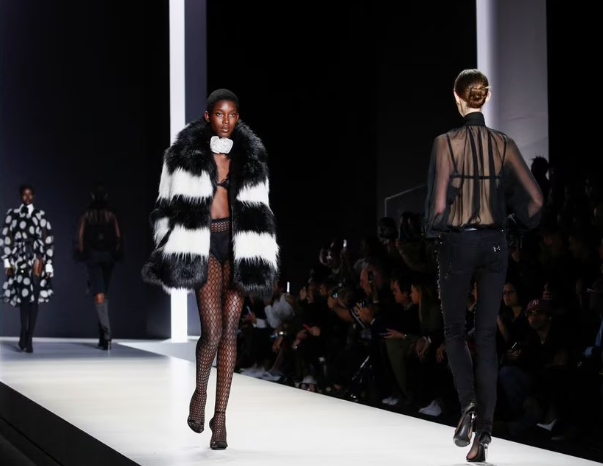 Shfaqja u çel nën një sfond bardhezi, me një modele që në pasarelë u shfaq me pantallona të shkurtra, çorape të gjatë e një xhaketë over size, ndjekur më pas nga veshje bardhezi.