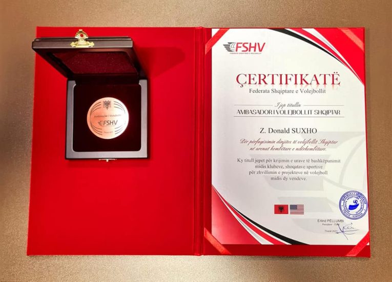 Gazeta Si – Donald Suxho, korçari që ka luajtur për kombëtaren amerikane të volejbollit, dhe Erblira Bici, volejbolliste e Romës dhe Kombëtares, janë nderuar së fundi nga Federata Shqiptare e Volejbollit me titullin honorifik ‘Ambasadorë të Volejbollit shqiptar’.