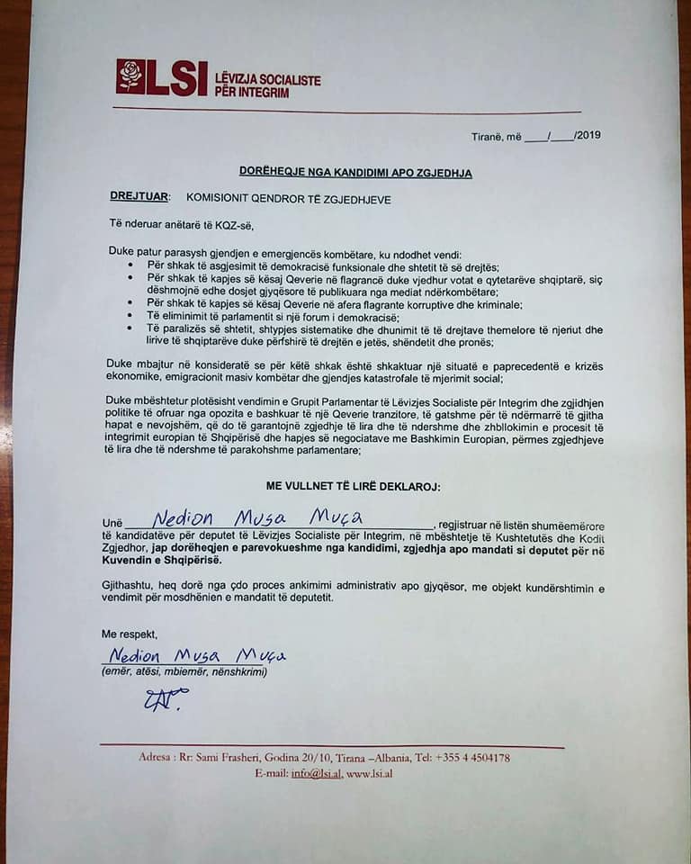 Në thelb deklarata e nënshkruar në tekstin është e njëjtë me atë që kanë nënshkruar deputetët e opozitës, por që në titull ka deklarim për dorëheqje nga kandidimi apo zgjedhja. “Jap dorëheqjen e parevokueshme nga kandidimi apo zgjedhje si deputet për në Kuvendin e Shqipërisë. Gjithashtu heq dorë nga procesi i animimit administrativ dhe gjyqësor, me objekt kundërshtimin për mos dhënien e vendimit për mandatin e deputetit”, thuhet në tekstin e deklaratës së firmosur nga kandidatët për deputetë.