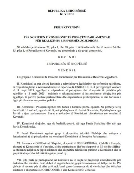 Komisioni për Reformën Zgjedhore do të ngrihet në barazi opozitë-mazhorancë. Në total komisioni do të ketë 16 anëtarë, 8 nga Partia Socialiste dhe 8 nga partitë e tjera opozitare. Komisioni do të drejtohet nga dy bashkëkryetarë një nga Partia Socialiste dhe një nga Partia Demokratike.