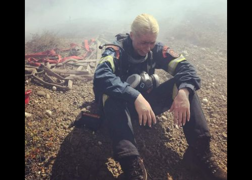 Zjarrfikësja duket e dorëzuar përballë flakëve dhe tymit ndërsa qëndron e ulur dhe qan.