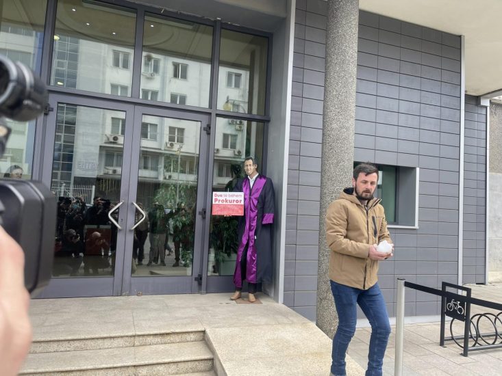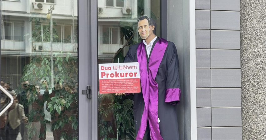 Nga Gazeta ‘Si’-Partia Socialdemokrate ka vendosur para Kuvendit të Kosovës një manekin me fytyrën e kryeministrit Albin Kurti, i veshur me togën e prokurorit ku shkruhet “Dua të bëhem prokuror”.
