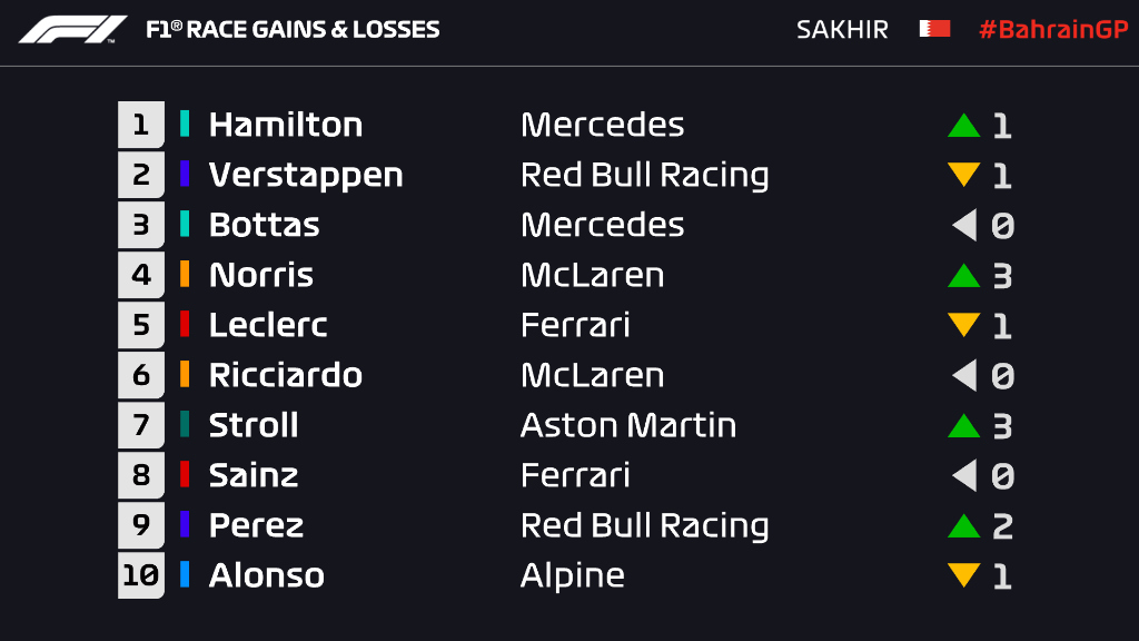 Forca e tretë është konfirmuar MekLaren, me vendin e 4-t të fituar nga Lando Norris, që doli para Serxhio Perezit. Ferrari ngushëllohet me vendin e 6-të të Leklerk, kurse Sainz e mbylli garën në vend të 8-të, pas Riçardos. Garë e dobët për Sebastian Fetel.