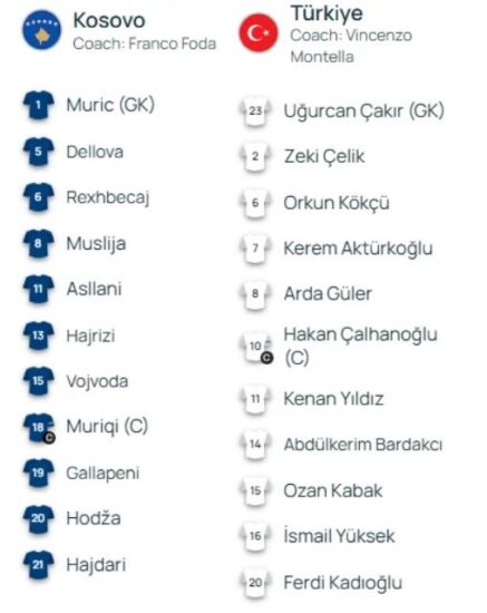Kosova: Muric, Dellova, Hajrizi, Hajdari, Gallapeni, Vojvoda, Hoxha, Rexhbecaj, Muslija, Asllani, Muriqi.
