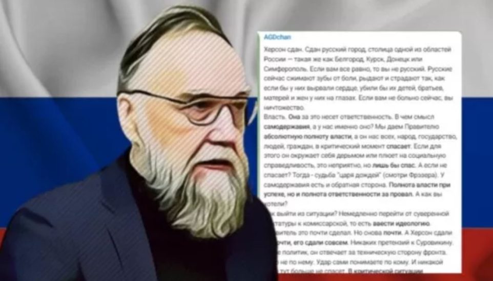 “Perëndimi”, shkruan Dugin në një deklaratë të gjatë në Telegram, “po fillon të transmetojë trillimet se patriotët rusë dhe unë u kthyem kundër Putinit pas dorëzimit të Khersonit dhe se ne, me sa duket po bëjmë thirrje për përmbysjen e tij. Kjo vjen nga askund dhe bazohet në një mesazh nga unë të cilin gjoja e kam fshirë. Sigurisht, askush nuk do ta besojë këtë, por për çdo rast: askush nuk është larguar nga Putini, unë dhe të gjithë patriotët rusë e mbështesim pa kushte. Dhimbja nga humbja e Khersonit është një gjë, qëndrimi ndaj komandantit të përgjithshëm, është një gjë tjetër. Ne i jemi besnikë Putinit dhe mbështesim deri në fund operacionin special ushtarak të Rusisë”.