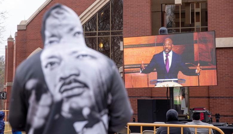 Senatori amerikan, Reverend Raphael Warnock shfaqet në një ekran ndërsa njerëzit mblidhen për të parë një shërbim përkujtimor për Ditën e Martin Luther King