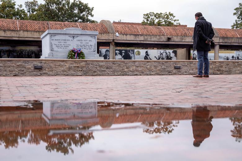 Një burrë qëndron me kokën ulur në The King Center në Atlanta, Georgia