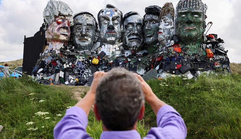 Një burrë fotografon “Mount Recyclemore”, një vepër arti që përshkruan udhëheqësit e G7 duke parë drejt Gjirit Carbis, të bëra nga mbeturinat elektronike nga artistët Joe Rush dhe Alex Wreckage në Britani. / REUTERS / Fotografia e realizuar Tom Nicholson.