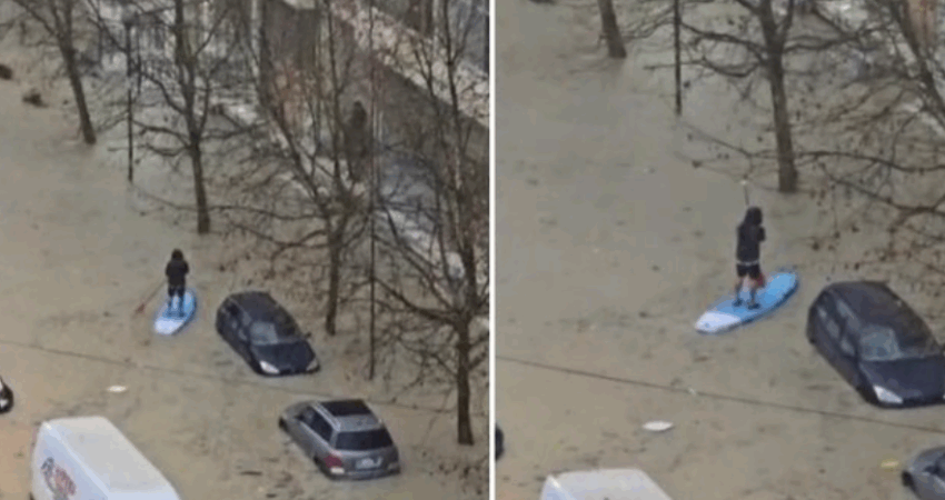 Ai është parë në rrugët e Durrësit duke lundruar mbi një dërrasë sërfi dhe duke kaluar ujin me një lopatë.