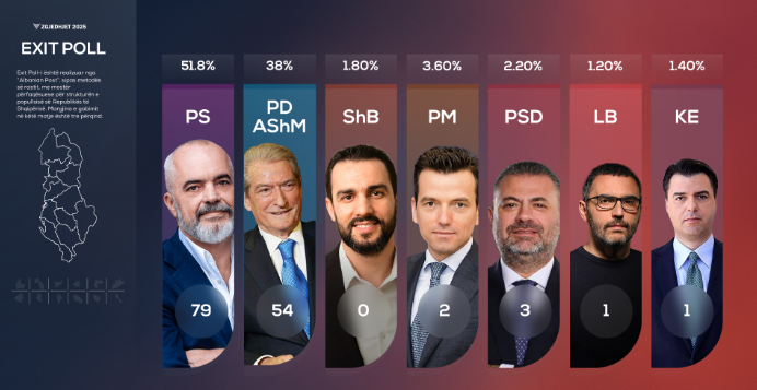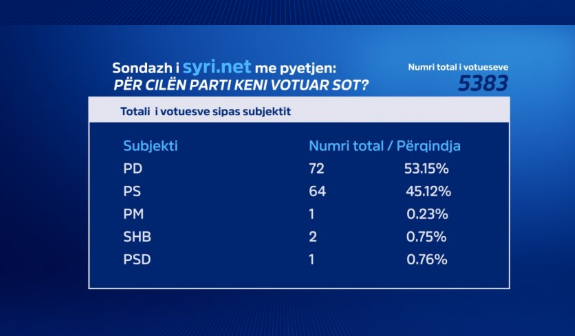Ndërkohe “SyriTv” ka publikuar Exitpoll-in e realizuar me 5383 votues ku Aleanca për Shqipërinë madhështore kryeson me 53.15 për qind të votave ose 72 deputetë ndjekur nga Partia Socialiste me 45.12 për qind të votave ose 64 deputetë.