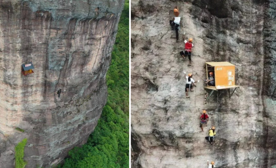 I varur 120 metra mbi tokë, dyqani prej dy metrash katrorë ofron pije për alpinistët në zonën Shiniuzhai, në provincën kineze të Hunanit.