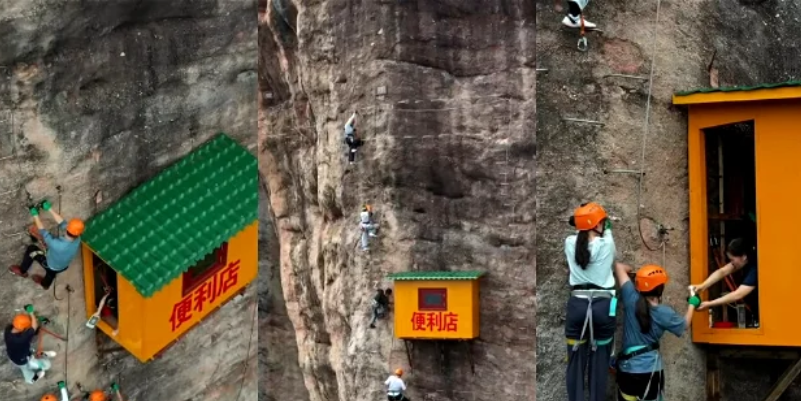 Një ndërtesë e vogël prej druri, e vendosur në një shkëmb në një rajon piktoresk të Kinës jugore ka fituar emrin si “dyqani më i papërshtatshëm” në vend.