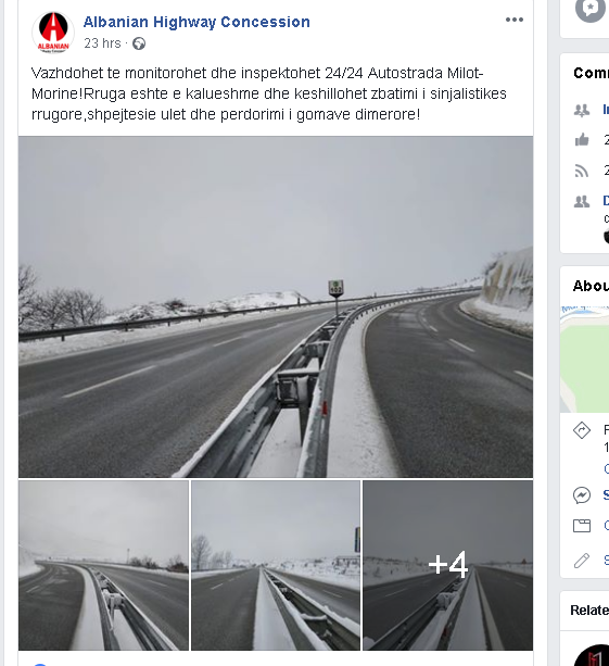 “Aksi Milot Morinë, është i kalueshëm në gjithë gjatësinë e tij! Trafiku është i rrjedhshëm dhe pa probleme! Shoqëria koncesionare vazhdon monitorimin, pastrimin e rrugës dhe kriposjen e këtij aksi!”- shkruan kompania koncensionare “Albanian Highway Concession” në faqen e saj në facebook, por komentet e qytetarëve, fotot dhe videot nga Rruga e Kombit e përgënjeshtrojnë.