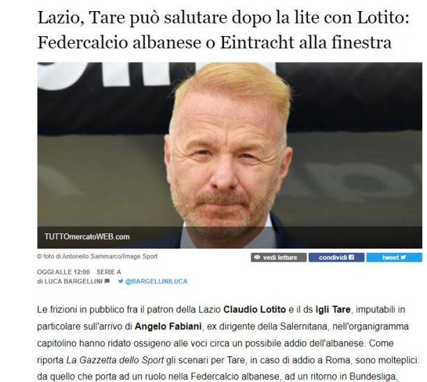 Një lajm i bujshëm vjen nga Italia, Igli Tare është pranë “divorcit” nga Lacio dhe po mendon seriozisht që të marrë një pozicion në Federatën Shqiptare të Futbollit.