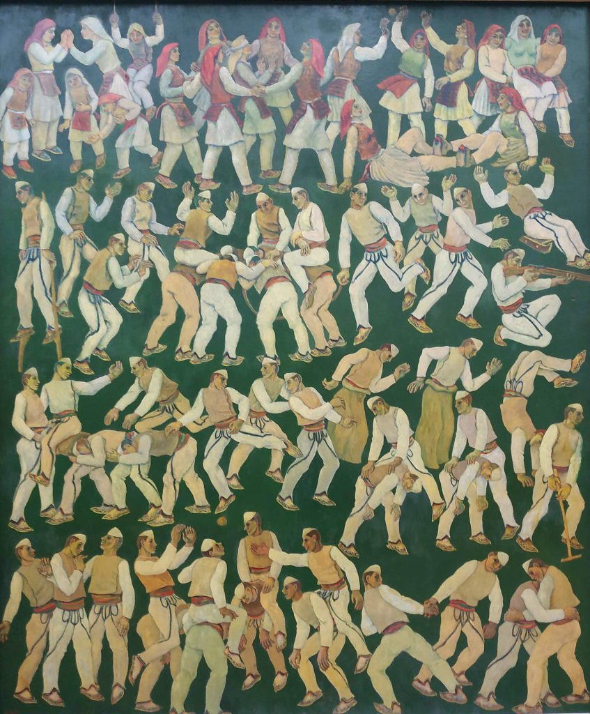 Elementët romantikë, religjiozë zhduken në një parajsë tokësore, ku e vetmja e vërtetë është materializmi, ndërsa portretet njerëzore humbasin çdo shprehi e gjendje emocionale, çdo rrudhë apo asimetri, duke u shndërruar në figura madhështorë, të patëmeta, gati-gati si shtatoret helenike të atletëve, por groteske. Periudhë të cilën, Maks Velo (pikturat e të cilit nuk janë vendosur në ekspozitë, megjithëse i ka dhuruar një koleksion GKA-së), e etiketoi si “Surrealizmi Socialist”, ku gjithçka vinte e ekzagjeruar, gjiganteske dhe mëtonte të krijonte një realitet imagjinar. Një lloj simulacra, që i bëri njerëzit të imitonin qëndrimet e subjekteve të pikturave e skulpturave.