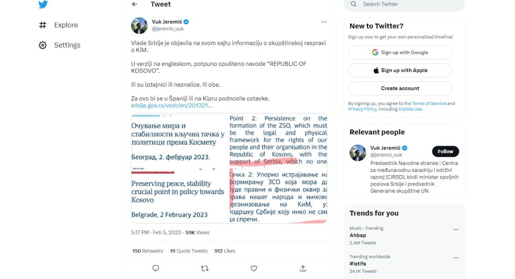 Ajo tha se kjo përmbajtja ishte larguar menjëherë nga ueb-faqja e Qeverisë serbe.
