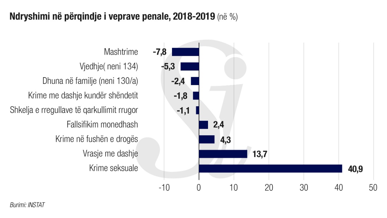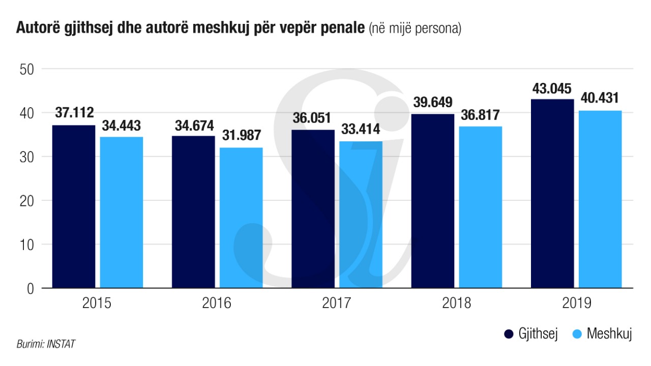Për sa i përket kategorisë së veprave penale, ku bëjnë pjesë edhe krimet seksuale tregohet se janë regjistruar në total 43.045 autorë për vepër penale, 8,6 % më shumë, krahasuar me vitin 2018. Numri i autorëve sipas veprave penale përfshin numrin e personave të dyshuar të cilët mund të jenë të pranishëm në më shumë se një vepër penale dhe autori numërohet në të gjitha veprat ku është i dyshuar. Statistikat kanë treguar se numri i autorëve pa përsëritje në veprat penale në krahasim me vitin 2019 është 36.083 autorë, 4,5 % më pak, krahasuar me vitin 2018.