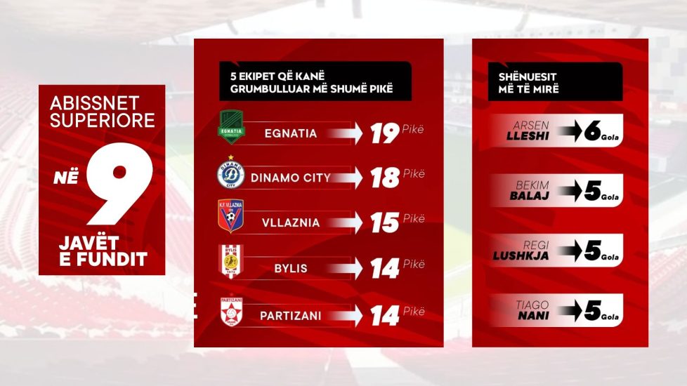 Sa i përket 9 javëve të fundit, skuadra më e mirë ishte Egnatia e cila grumbulloi 19 pikë, mjaftueshëm për tu ngjitur në krye të klasifikimit. Vetëm me një pikë më pak ndjek Dinamo City (qan humbjen me Bylis) që me Ilir Dajën ka kthyer katërcipërisht fatin e sezonit. Vllaznia vuan humbjen direkte me Egnatian që e la me 15 pikë pas 9 javëve. Pas saj Bylis dhe Partizani. Ballshiotët luajnë për konfirmimin ndërsa të kuqtë kryeqytetas vështirë se arrijnë te titulli me këtë ecuri. Shënuesi më i mirë vjen nga AF Elbasani ku Arsen Lleshi shënoi 6 gola, i ndjekur nga një trio e përbërë nga Balaj (Vllaznia), Lushkja (Egnatia) dhe Nani (Dinamo City ) me një gol më pak.