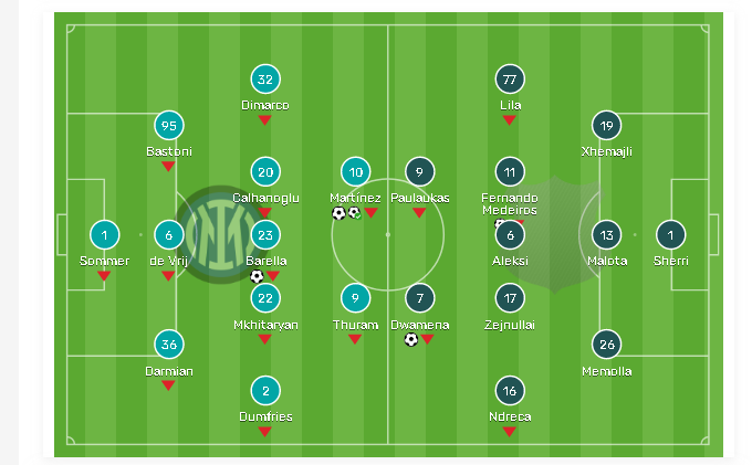 Inter (3-5-2): Somer; Darmian, De Vrij, Bastoni; Dumfris, Barela, Çalhanoglu, Mkhitarian, Dimarko; Turam, Lautaro martinez. Në dispozicion: Di Xhenaro, Audero, Sensi, Korrea, Fratezi, Kuadrado, Lazaro, Asllani, Bisek, Stabile, Sarr, A.Stankoviç. Trajner: Simone Inzagi.