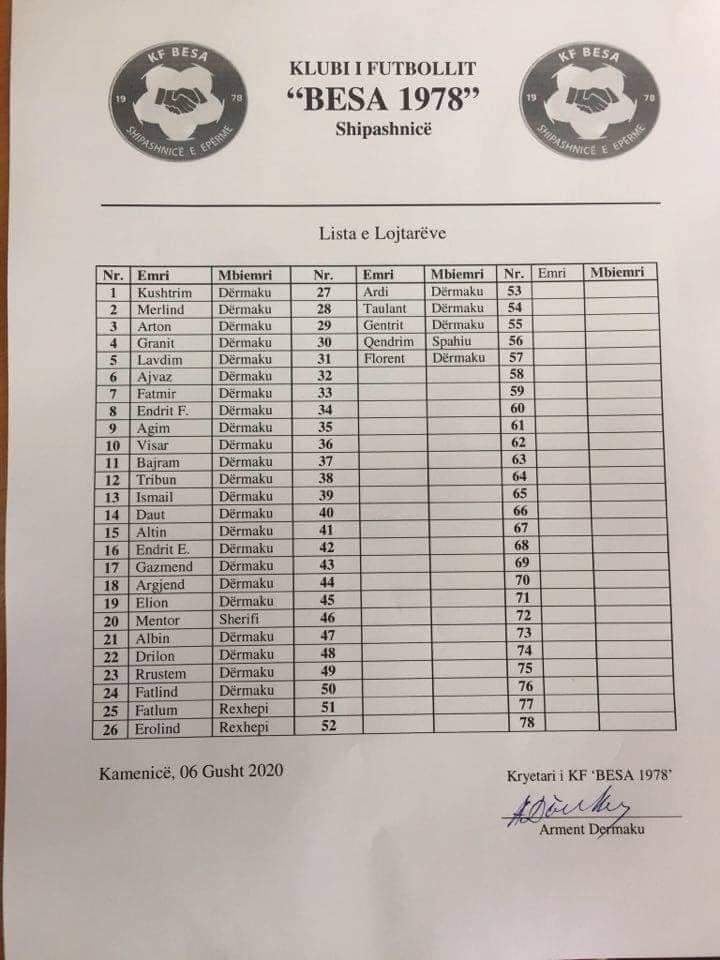 Historia e pabesueshme e KF Besa 1978, ekipit kosovar, ekipit të Kamenicës, që luan në Ligën e Tretë. Në sezonin 2020/2021, për herë të parë në historinë e futbollit kosovar, kjo skuadër ka federuar 26 lojtarë me të njëjtin mbiemër: Dërmaku. Por nuk mbaron me kaq. Gjithashtu trajneri, ka të njëjtin mbiemër: Arment Dërmaku.