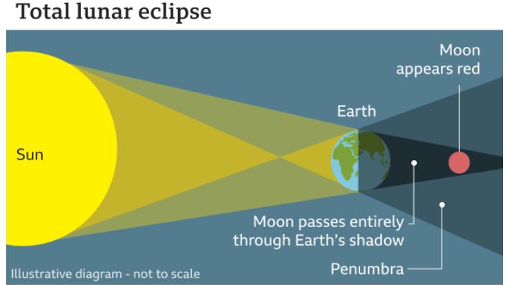 Ndërsa hija e Tokës fillon të mbulojë Hënën, ajo ngadalë merr një ‘pickim’ prej saj. Hëna do të jetë plotësisht e eklipsuar dhe e kuqe. Më pas do të perëndojë.