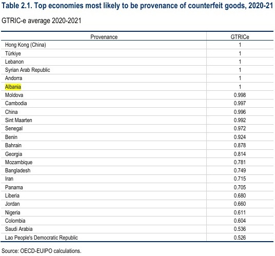 Raporti i Agjencisë së Pronësisë Intelektuale pranë BE-së, thotë se Shqipëria është vendi i vetëm nga Europa që tregton/eksporton ose prodhon mallra të falsifikuara. Indeksi GTRIC që mat prirjen e një ekonomie për të eksportuar produkte imitime e vlerëson Shqipërinë me 1 pikë, aq sa Hong Kongu dhe Turqia, që njihen si “mëma” të prodhimeve false nëpër botë.