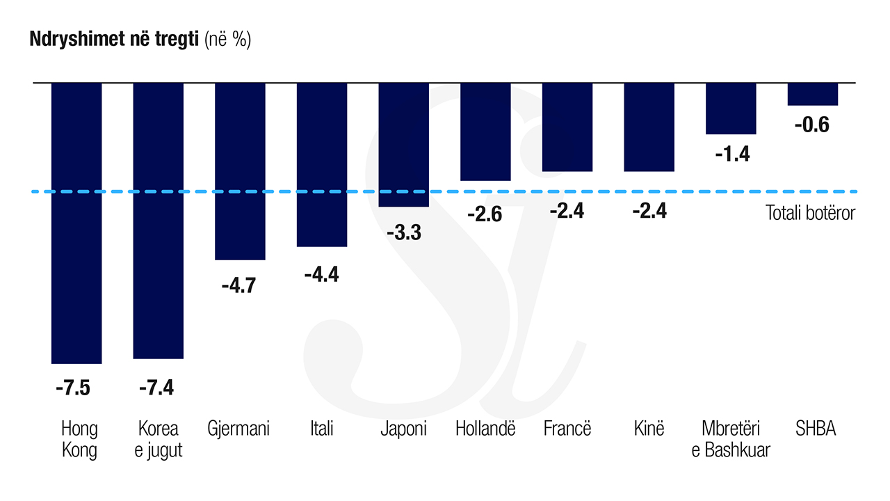 Të dhënat e Organizatës Botërore të Tregtisë (OBT) për tre tremujorët e vitit 2019 tregojnë se tregtia totale e mallrave botërore ka rënë 2.9% nga një vit më parë duke u ulur në dhjetë tregjet kryesorë në botë.