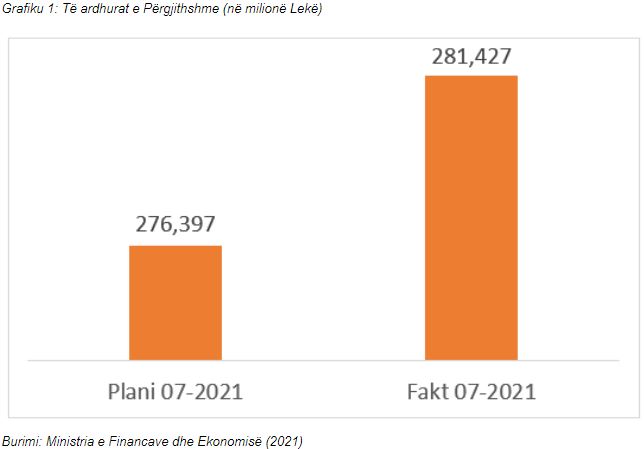 Të ardhurat tatimorepër 7- mujorin 2021 u realizuan në masën 141.5 miliardë lekë, 19.7 miliardë duke u rritur me 16.2% më shumë se 7- mujori i vitit të kaluar ndërsa të ardhurat nga TVSH e arkëtuar (bruto) u rritën me 29.1% më shumë se 7-mujori 2020.