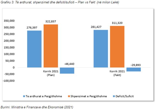 Niveli i deficitit për periudhën 7- mujore të vitit 2021 rezultoi në rreth 29.9 miliardë lekë, ose rreth 19.5 miliardë lekë më pak se e njëjta periudhë e një viti më parë.