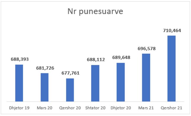 Rimëkëmbja e ekonomisë është reflektuar edhe në tregun e punës, ku sipas të dhënave, numri i të punësuarve në qershor 2021 arriti në 710,464 persona, nga 667,761 persona që ishte në qershor 2020.