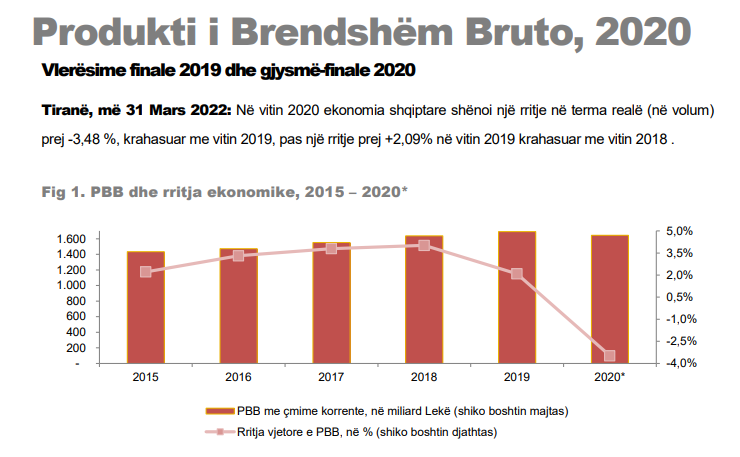 Në vitin 2020 ekonomia shqiptare shënoi një rënie me 3.5%, pas rritjes me 2.9% në vitin 2019.