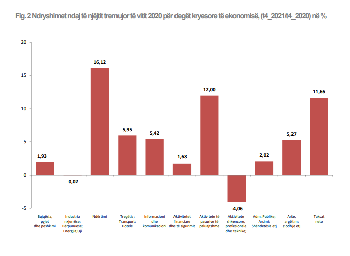 Rritja ekonomike në vend gjatë tremujorit të fundit 2021 raportohet 5.5% nga Instat, ku në raport vjetor kontributi më të madh e ka dhënë ndërtimi, me 1.8% rritje. Ndjekur nga tregtia, transporti, akomodimi dhe shërbimi ushqimor me 1%.
