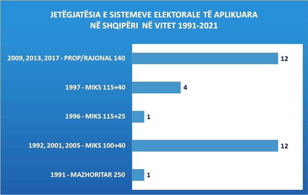 Kalimi nga ekstremi në ekstrem, mazhoritar (1991) në proporcional me lista të mbyllura (pas 2008) dhe ndryshimi 3 herë i formulës miks (1992, 1996, 1997), janë tregues se partitë kryesore kanë synuar e diktuar që përmes teknikaliteteve dhe trukeve të sistemit zgjedhor të mbajnë nën kontroll sistemin përfaqësues dhe të pamundësojnë konkurrencën alternative. Për të kuptuar tabelën duhet sjellë ndërmend edhe fakti se asnjë prej sistemeve të votimit nuk është zgjedhur nga qytetarët dhe sistemi aktual është ndryshuar në vetëm 4 orë bisedime të mbyllura në prill 2008. Shqipëria futet nga vendet e pakta që e përfshirë sistemin zgjedhor në Kushtetutë, çfarë do të thotë, se për ndryshimin e tij duhen ndryshime kushtetuese, – por ndryshimi Kushtetutës sipas legjislacionit tonë, nuk bëhet me referendum, bëhet vetëm me 92 vota në parlament me kusht politik që asnjëra palë kryesore të mos ankohet.