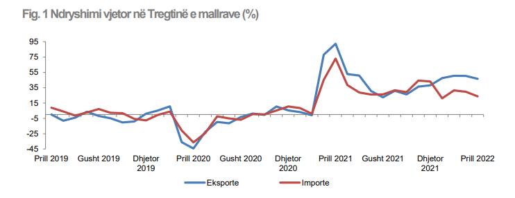 Në të gjithë katërmujorin, eksportet e mallrave arritën vlerën 162 mld lekë, duke u rritur me 49%, ndërkohë importet e mallrave arritën vlerën 285 mld lekë, duke u rritur me 27%, krahasuar me një vit më parë. Deficiti tregtar arriti vlerën 123 mld lekë, duke u rritur me 6 %, krahasuar me të njëjtën periudhë të 2021.