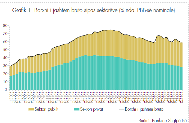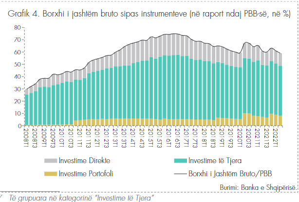 Stoku i borxhit të jashtëm bruto u rrit me pothuajse 13% në fund të gjashtëmujorit të parë 2022, por pesha e tij ndaj PBB-së u ul me 1.7 pikë përqindje, me 59.1% ndaj Produktit Bruto. Por kjo, sipas Bankës së Shqipërisë, rënia lidhet me rritjen nominale të PBB-së dhe rritja e borxhit lidhet me emetimin e Eurobondit në fund të vitit 2021, 650 mln euro.