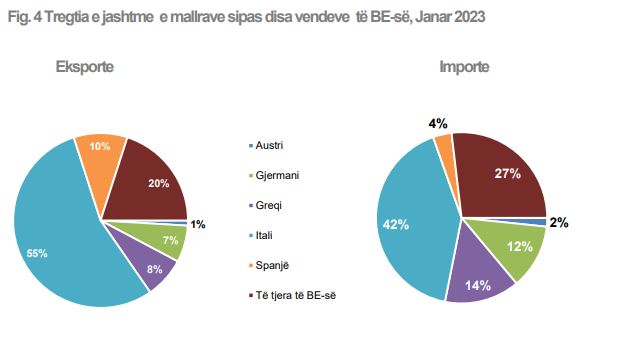 Eksportet drejt vendeve të BE-së gjatë janarit zënë 68.8 % të eksporteve gjithsej dhe importet nga vendet e BE-së zënë 4.9 % të importeve gjithsej. Partnerët kryesorë tregtarë janë: Italia (27.5 %), Turqia (7.2 %) dhe Greqia (7.0 %).