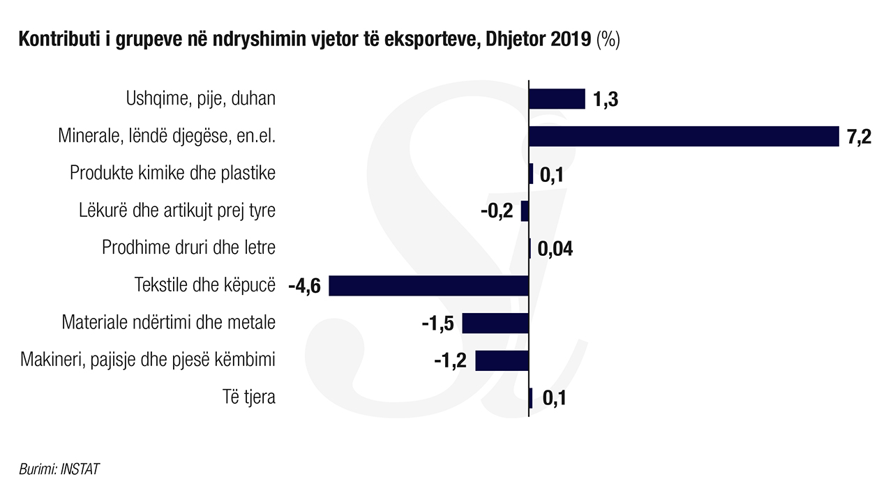 Grupet që kanë ndikuar negativisht në uljen vjetore të eksporteve janë: “Materiale ndërtimi dhe metale”, “Minerale, lëndë djegëse, energji elektrike”, “Tekstile dhe këpucë”. Në ndryshimin vjetor të eksporteve kanë ndikuar pozitivisht grupet: “Ushqim, pije, duhan”, “Makineri, paisje dhe pjesë këmbimi”, “Produkte kimike dhe plastike”.