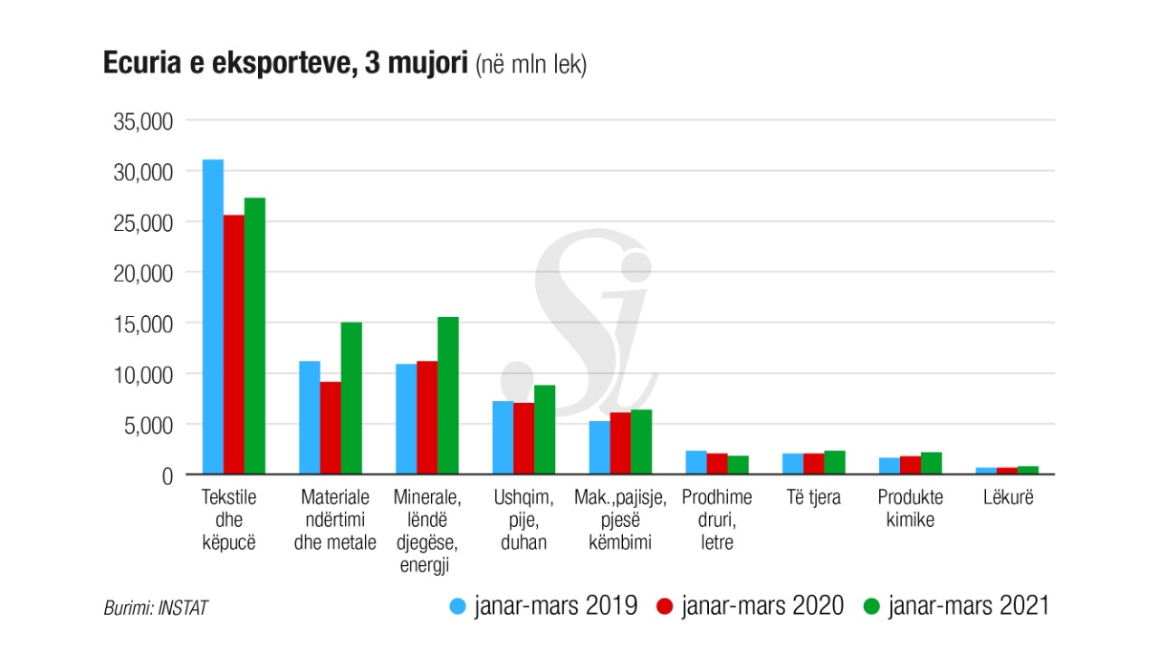 Për këtë tremujor eksportet u rritën me 22%, në krahasim me të njëjtën periudhë të 2020-s dhe arritën vlerën 80 miliardë lekë.