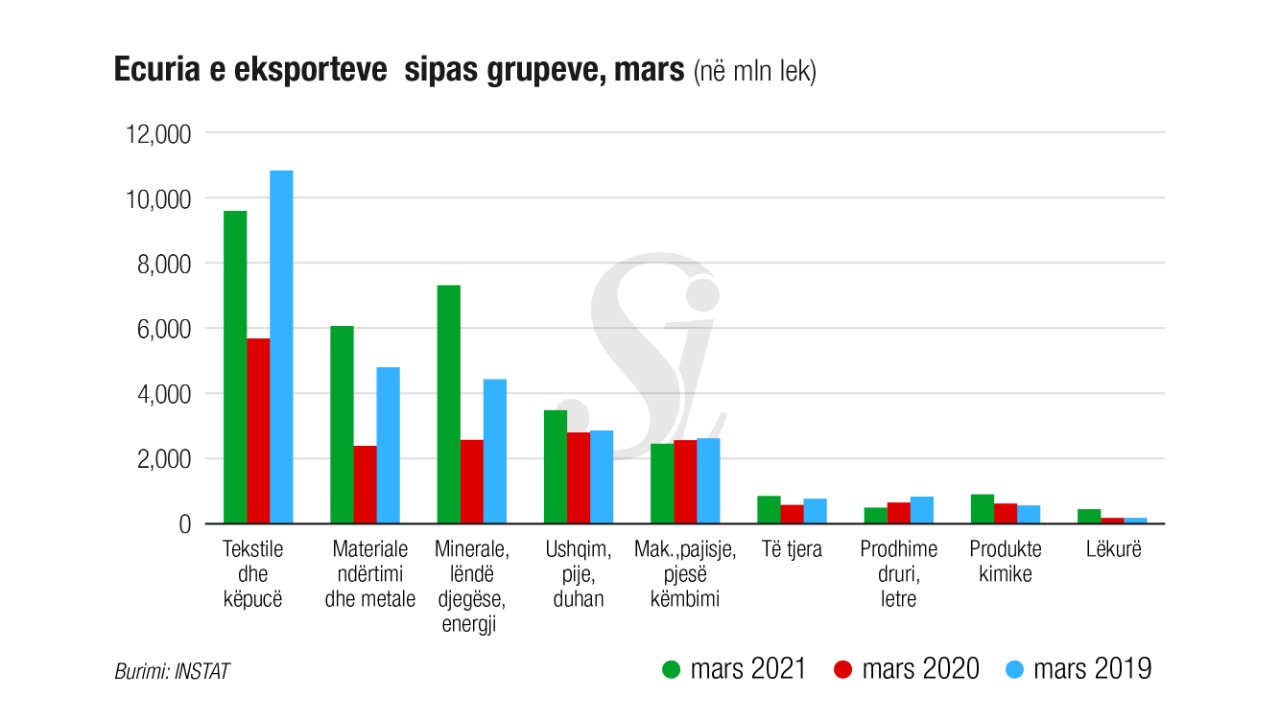 Grupi me ecurinë më të mirë është “Materiale ndërtimi dhe metale”, që është rritur me 64% për 3 mujorin, ndërsa në raport me periudhën janar-mars 2019, shifrat janë 32% më të larta.