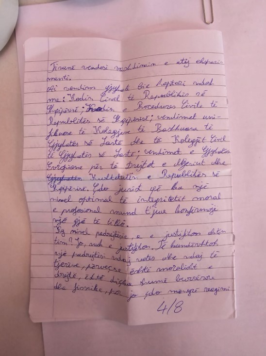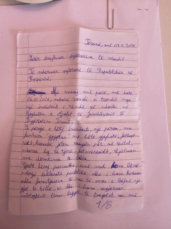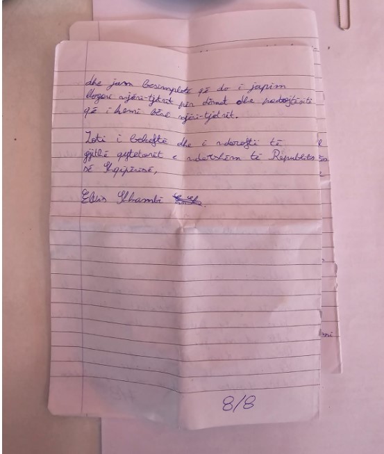 Gazeta Si – Në një letër me shkrim dore nga ambientet e paraburgimit, Elvis Shakmbi, autori i vrasjes së gjyqtarit Astrit Kalaja, ka shprehur keqardhjen e tij për dhimbjen që u ka shkaktuar familjarëve të të ndjerit.